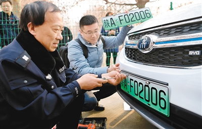 工作人员帮车主给新能源汽车挂上专用号牌 记者 翟小雪 摄