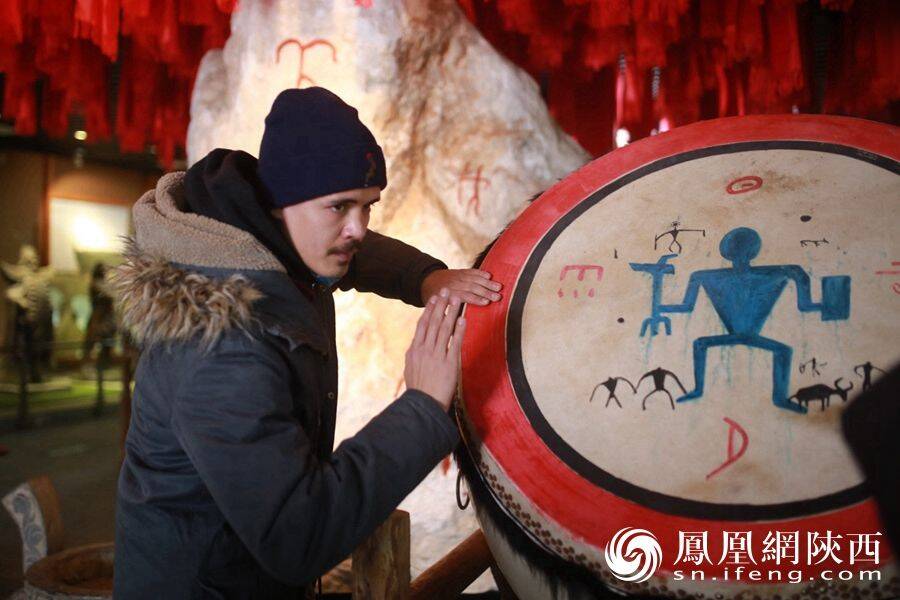 羌族是一个只有语言没有文字的民族,把“羊”作为民族图腾。这面大鼓上还有一些“民族印记”,来自瑞士的Justin,忍不住小试一番,鼓点还挺有律动的呢。