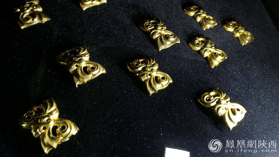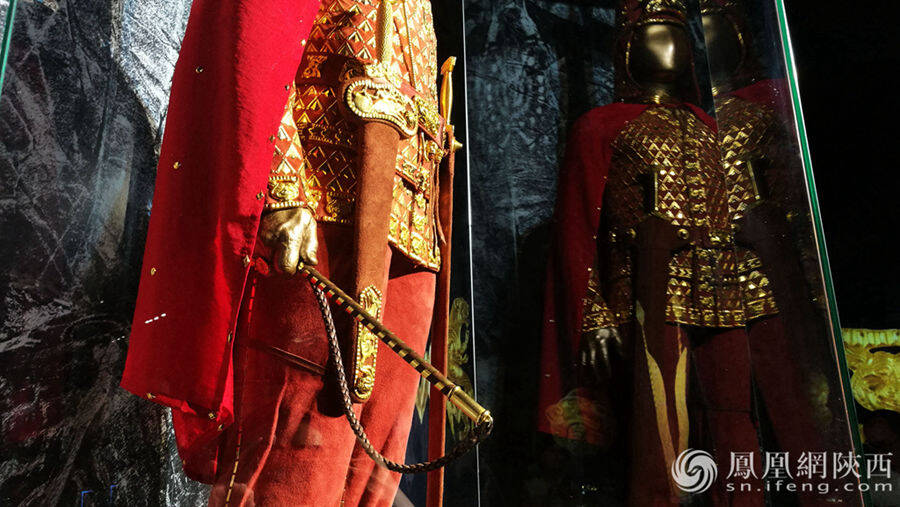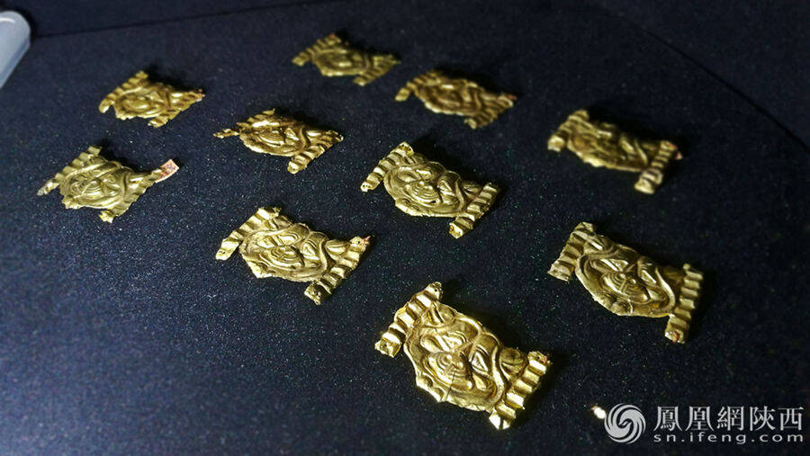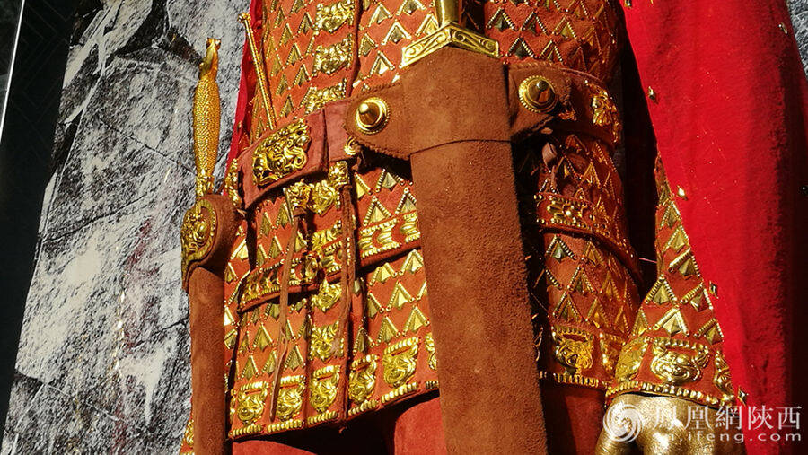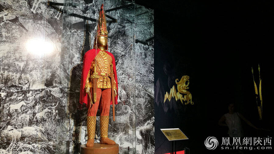 整件战服由4800个带动物、植物和几何图案的饰片,经锻造、冲压、錾刻等加工工艺制造而成。这些金箔大部分以乌鸦、虎、山羊、大头羊和鸟类等动物图案装饰为主。