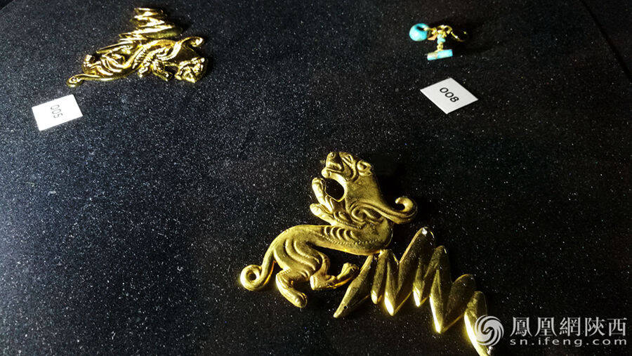 此次《伟大草原遗产:珍宝艺术》展,参展展品共计119类370件。所有展品均来自哈萨克斯坦国家博物馆,为哈萨克斯坦伊塞克墓出土的文物及其复制品,均精美绝伦,材质包括黄金、白银、丝绸、皮革、绿松石、玻璃等。图为老虎头像形式的背带徽章(原件),伊斯克墓地,公元前IV-III世纪。