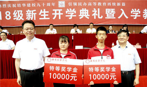 为了让更多的学习成绩优异的培华学子敢于有梦、勇于追梦、勤于圆梦,今年,西安培华学院投入200多万设立新生奖学金,千余名学生喜获奖励,动员大会上,校领导为获新生奖学金代表佩戴校徽并颁奖。
