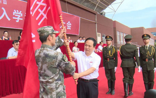 党委书记胡俊生向军训团授旗
